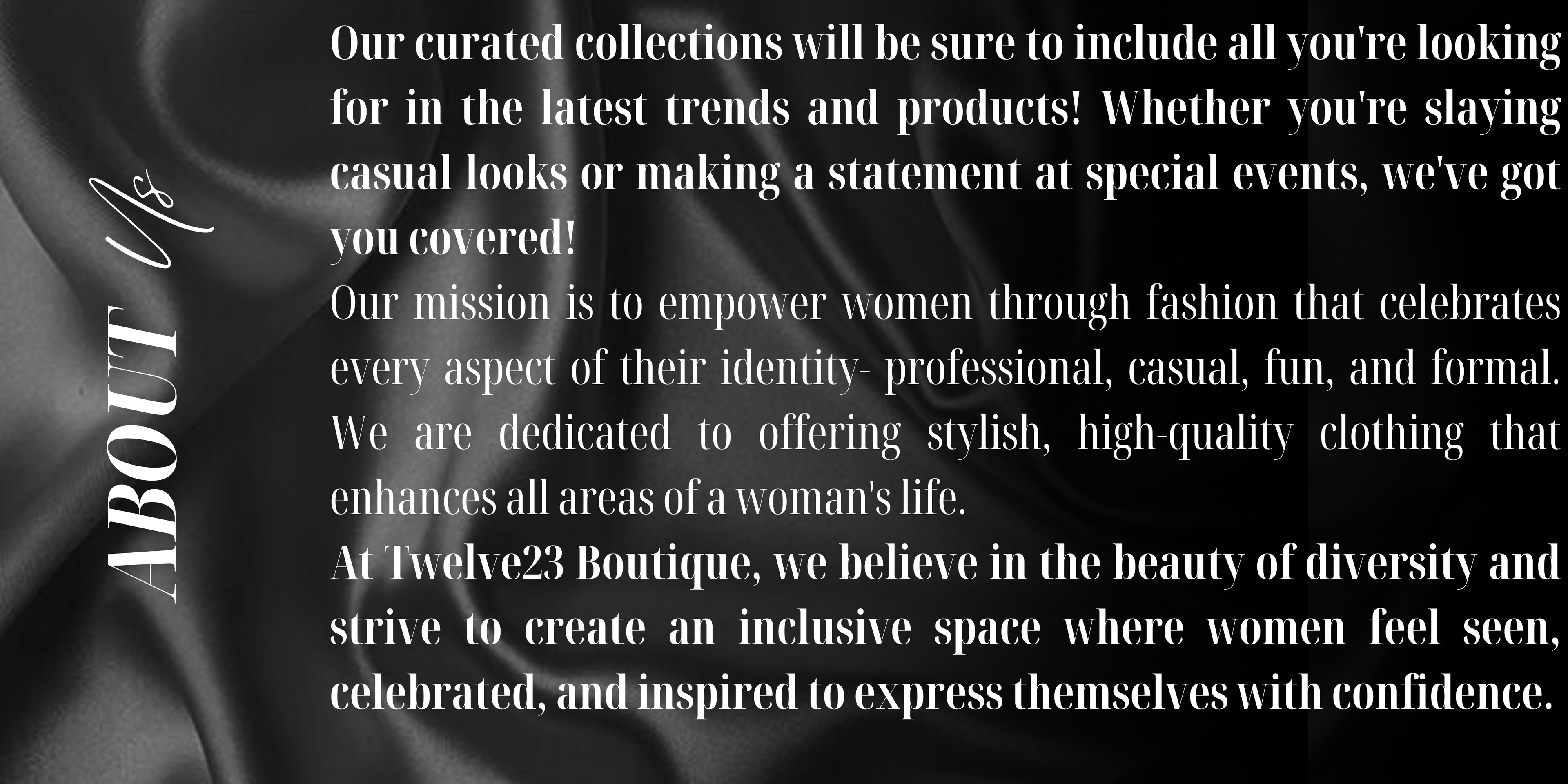 Your shopping experience with Twelve23 Boutique is our top priority. Our dedicated team is here to assist with sizing inquiries, and ensure that every purchase exceeds your expectations.